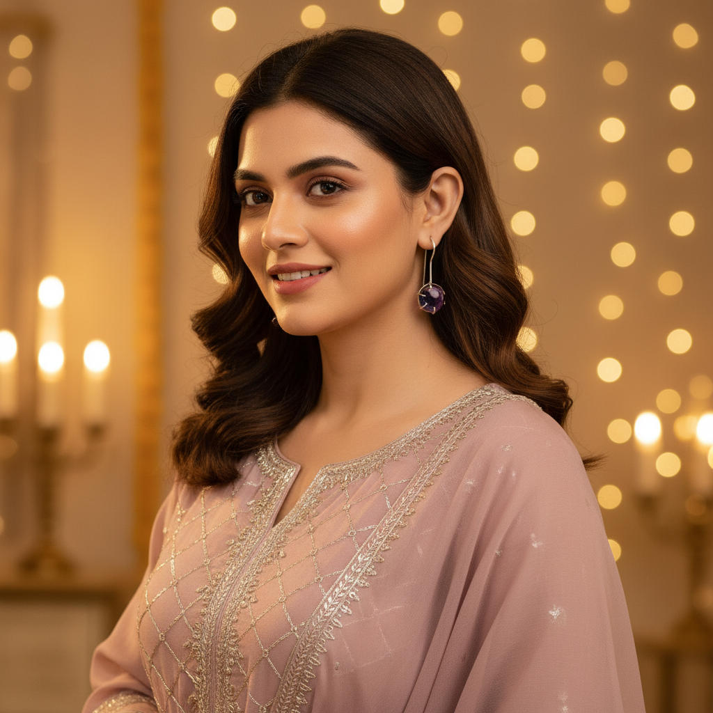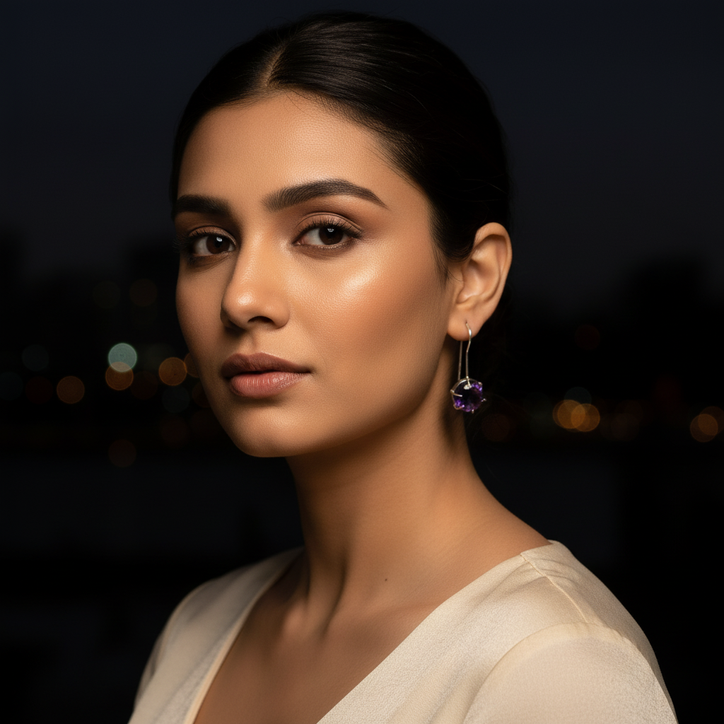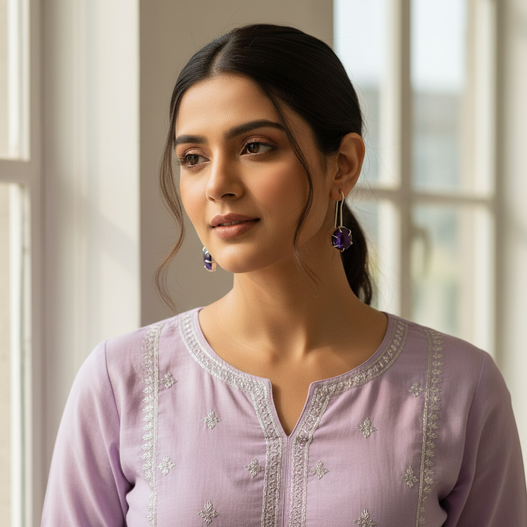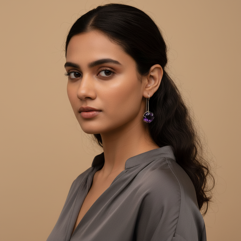 Style Tip: These amethyst drops pair beautifully with both Indian and Western outfits. Wear them with a lavender saree, silver-work kurta, of flowing chiffon suit for Indian looks, an with a white shirt, charcoal dress, or pastel blouse for Western styles.